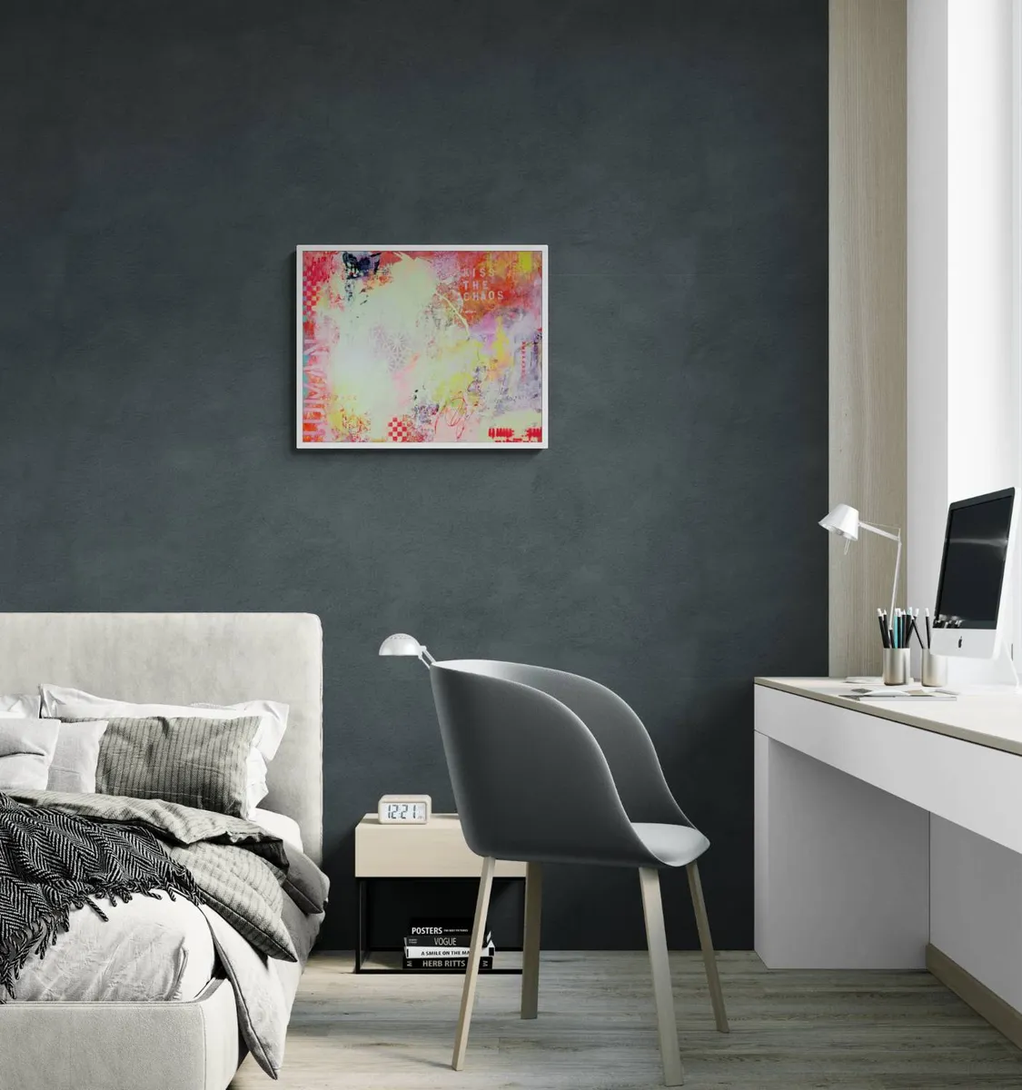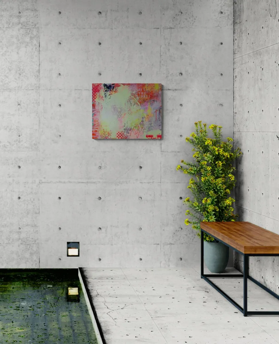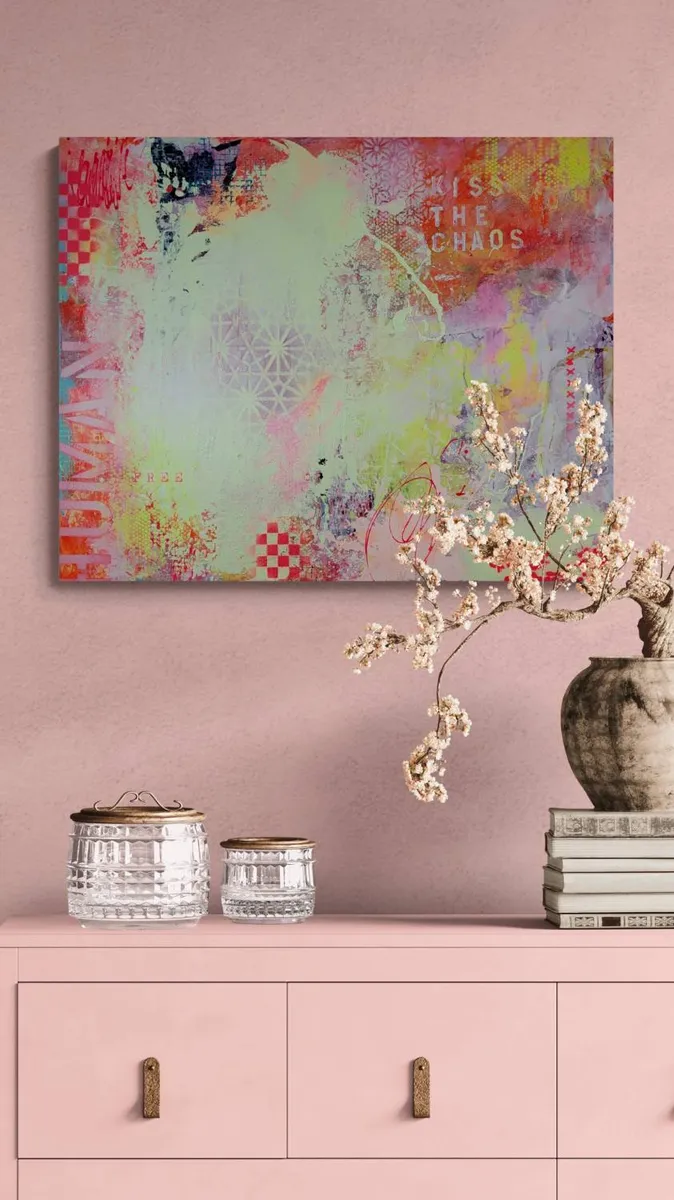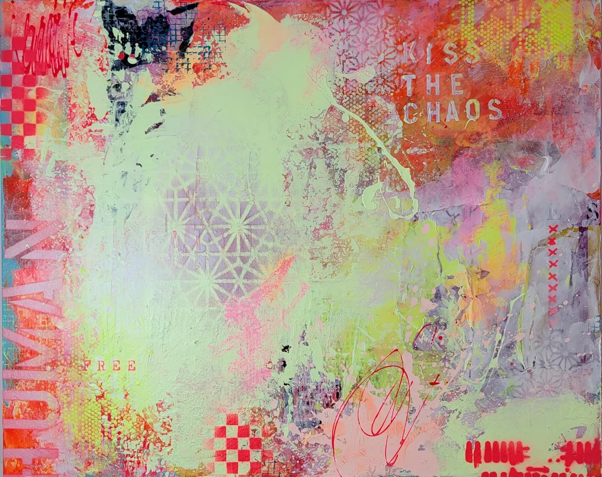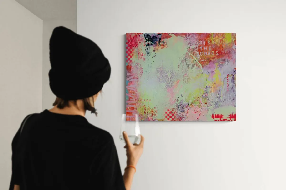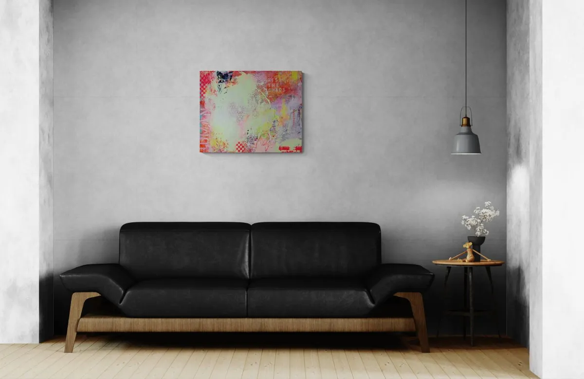 LIVRAISON GRATUITE AU CANADA — KISS THE CHAOS est une œuvre expressive et instinctive qui explore la rencontre entre le désordre et l’harmonie, entre la spontanéité du geste et la construction visuelle. Cette création invite le spectateur à embrasser l’imprévisible et à considérer le chaos non comme une rupture, mais comme une source d’élan et de renouveau. La composition se déploie à travers une palette vibrante et contrastée. Des rouges intenses, des roses éclatants, des jaunes lumineux et des verts acides s’entrelacent avec des zones plus douces et aériennes. Ces variations chromatiques génèrent une dynamique permanente, donnant l’impression que la surface est en mouvement, presque vivante. La lumière semble circuler librement sur la toile, renforçant l’impact émotionnel de l’œuvre. Les textures occupent une place centrale dans le langage plastique. Coulures, éclaboussures, superpositions et zones volontairement altérées créent une profondeur visuelle riche. Des motifs géométriques, des damiers et des formes répétitives émergent par fragments, suggérant une tentative d’ordre rapidement absorbée par le chaos du geste. Cette tension constante entre structure et liberté constitue l’essence même de l’œuvre. Les éléments typographiques et symboliques, notamment l’inscription « KISS THE CHAOS », apportent une dimension conceptuelle forte. Ils fonctionnent comme un message direct, invitant à accepter l’incertitude et à transformer le désordre en force créative. Chaque signe devient une trace, un repère émotionnel dans une narration volontairement fragmentée. Ancrée dans une démarche de peinture abstraite contemporaine, cette œuvre ne cherche pas à représenter le réel, mais à provoquer une expérience sensorielle et introspective. « KISS THE CHAOS » s’adresse à celles et ceux qui trouvent dans le chaos une forme de liberté, de beauté et d’authenticité. _100% œuvre originale peinte à la main. _L’œuvre arrive avec un certificat d'authenticité. _L’œuvre est signée par l'artiste. _Prête à accrocher. _L’œuvre est scellée/protégée avec deux couches de vernis satin.